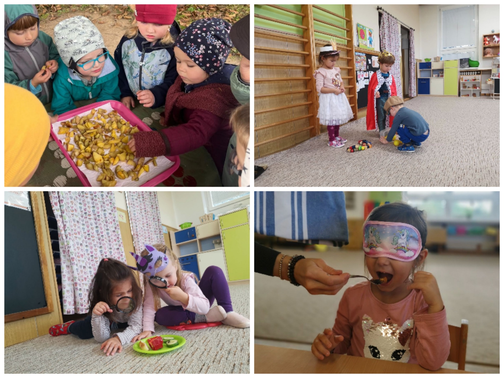 Děti měly možnost prozkoumat podzimní zeleninu a ovoce neobvyklým způsobem. Zjišťovali jsme, jak voní čerstvá mrkev, jaká je na dotek drsná dýně, jak hlasitě křupne jablíčko, když se do něj zakousneme, a jaké barvy ukrývá vnitřek červené řepy. 🧡