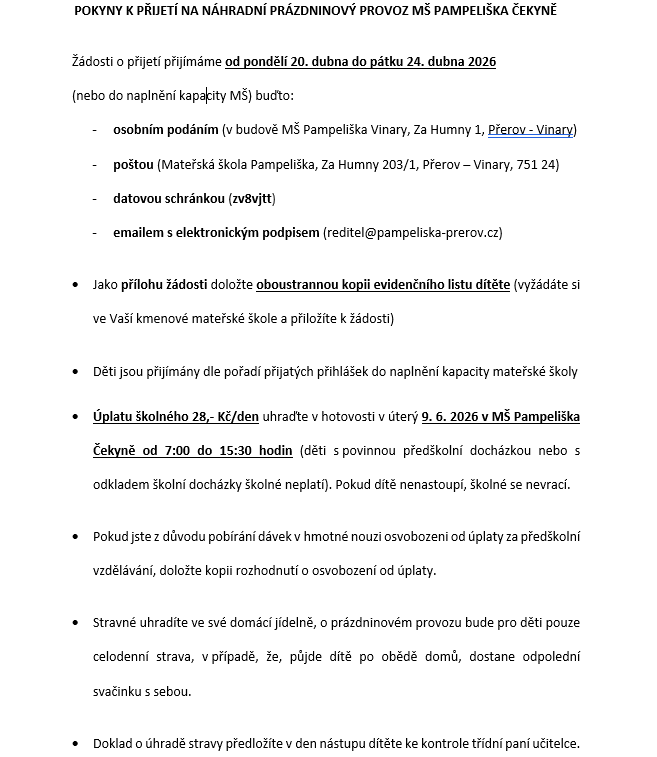 zde jsou uvedeny informace o prázdninovém provozu na Prázdniny 2026. Přihláška je k dispozici v sekci Dokumenty zde Dokumenty.